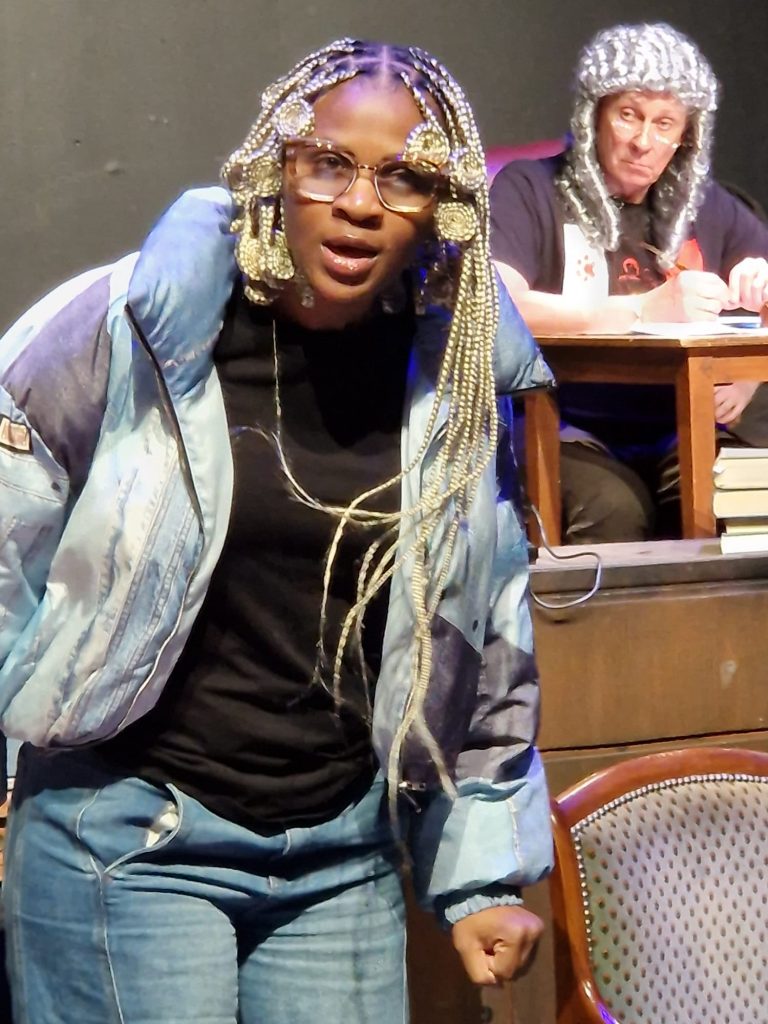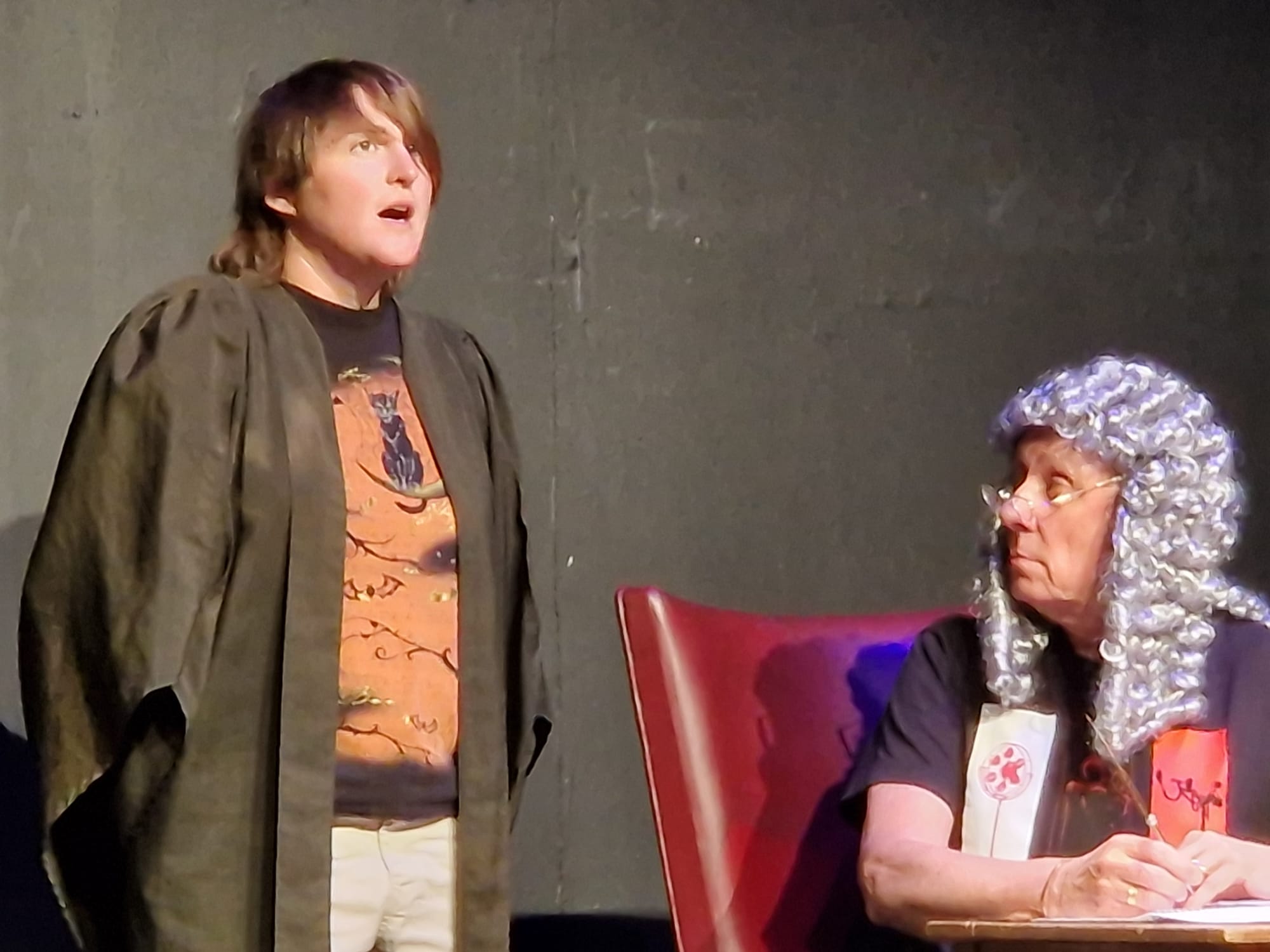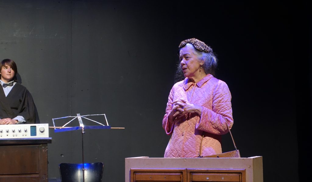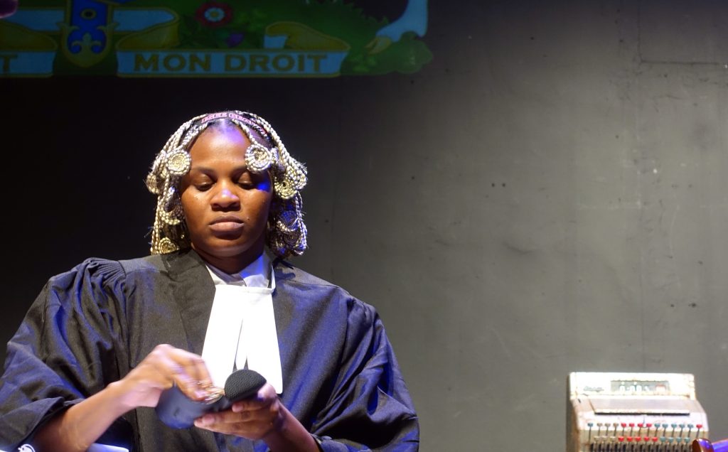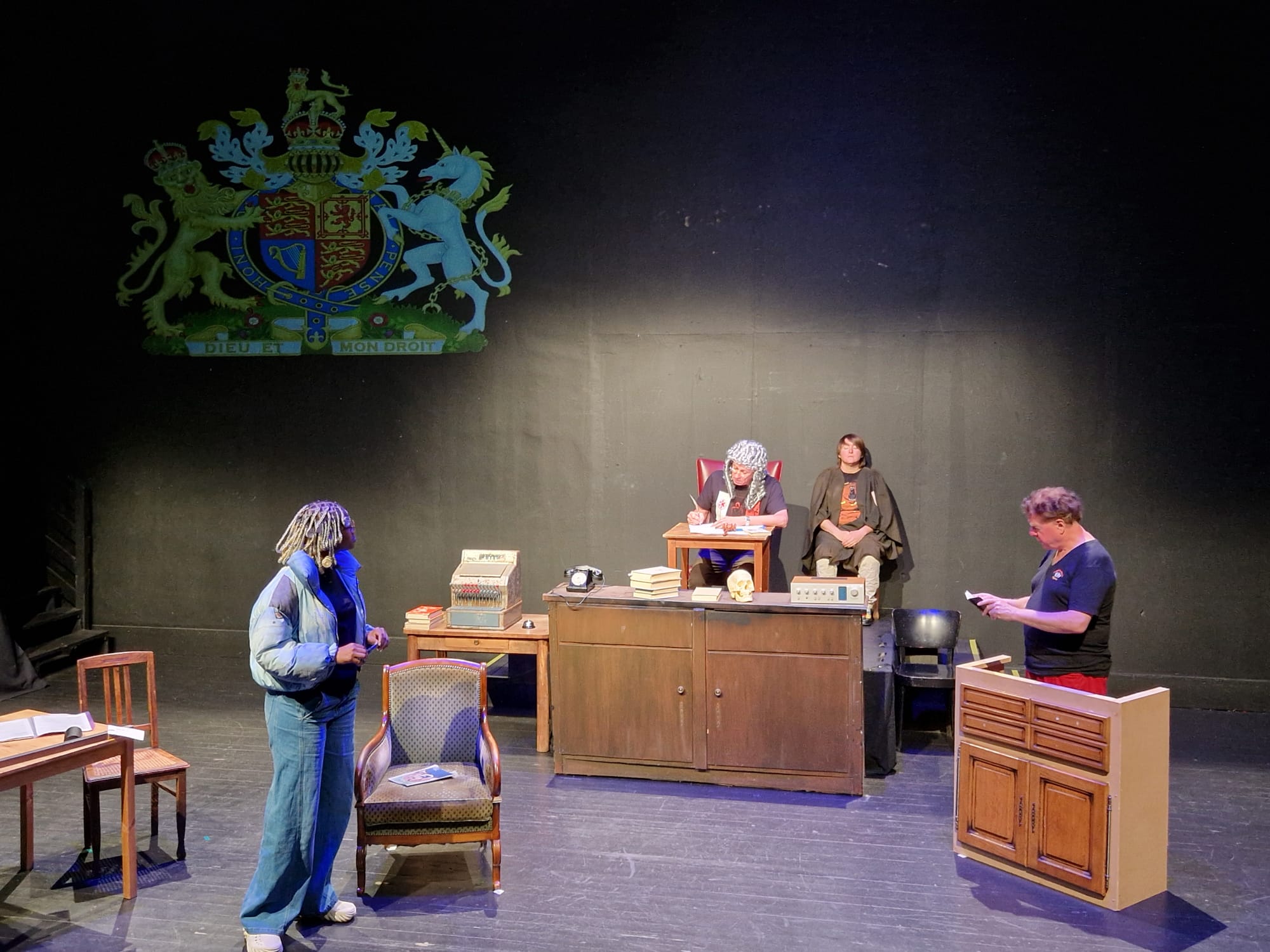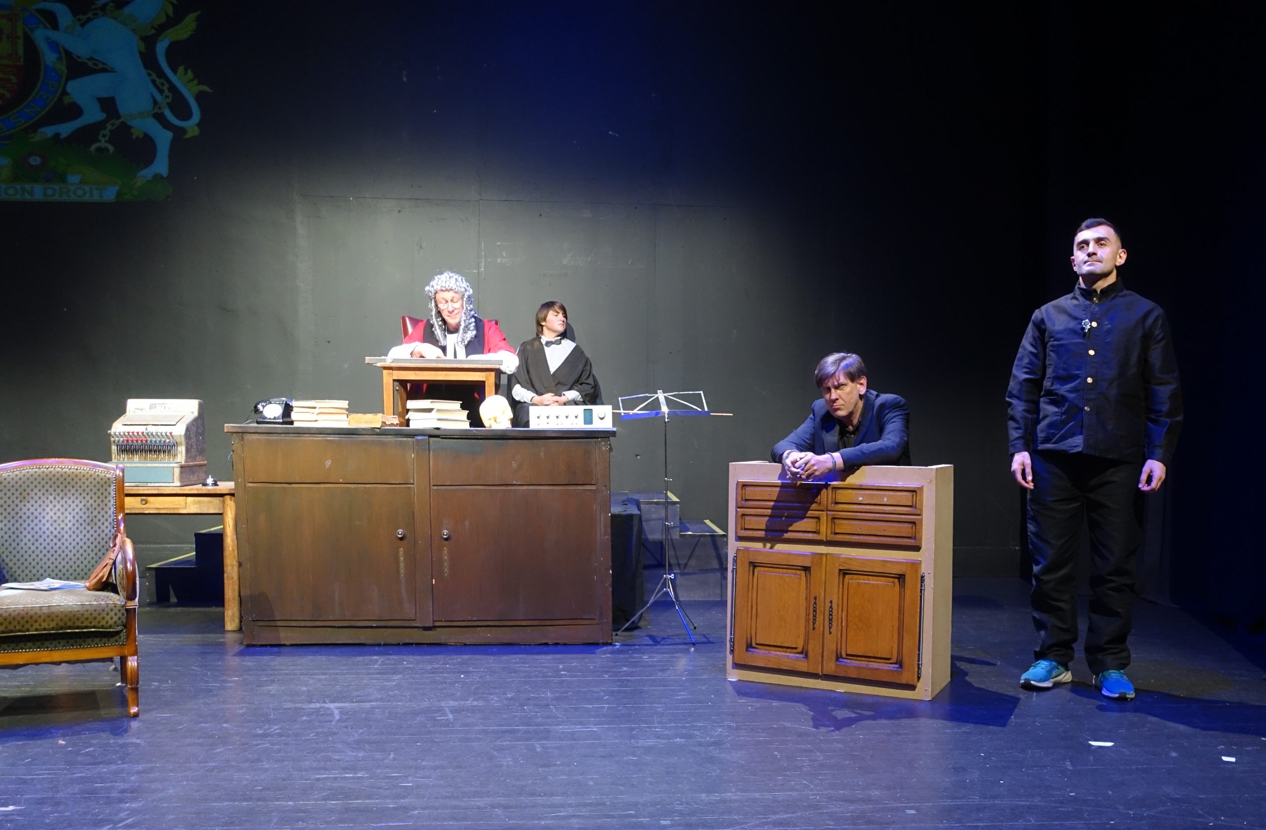 An ordinary house, somewhere in England, home to an equally ordinary family: Mum the housewife, who pays a lady to come every week to eat up the scraps; Dad, the DIY enthusiast who is building a replica of the Central Criminal Court in the living room; the daughter obsessed by the inappropriate length of her arms; and the son training a choir composed of speak-your-weight machines. Auntie in her wheel-chair dreams of fantastic travels. Then, all of a sudden, the Court begins to wake up: it’s a trial! But who is on trial, and what will the verdict be?